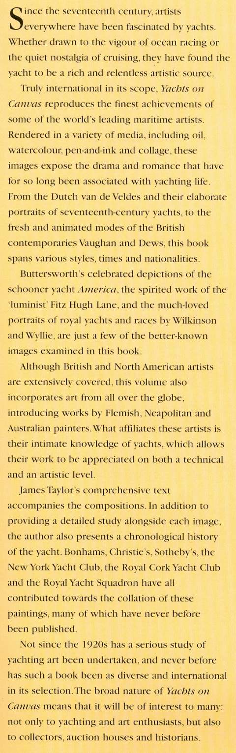 Artists’ Images of Yachts from the Seventeenth Century to the Present Day, album of colour paintings and b&w sketches with accompanying text, bibliography, index, 160 pp, navy blue boards in d/w, extremities of covers a trifle rubbed, otherwise in near fine condition, Conway Maritime Press 2005